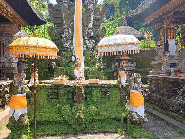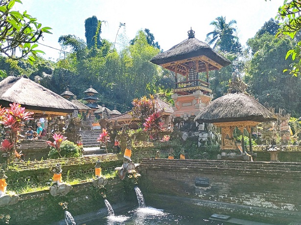 ಹಾಗಾದರೆ , ಮುಂದಕ್ಕೆ  ಹೋಗೋಣ ಎಂದು  ಅಲ್ಲಿಂದ 3 ಕಿಮೀ ದೂರದಲ್ಲಿದ್ದ   ‘ ತೀರ್ಥ ಎಂಪುಲ್’  ಗೆ   ಭೇಟಿ ಕೊಡುವುದೆಂದು ನಿರ್ಧಾರವಾಯಿತು.    ‘ವಿಷ್ಣು’ವಿನ ಮಂದಿರವಿರುವ  ಈ ಸ್ಥಳವು  ಬಾಲಿನೀಸ್ ಮತ್ತು  ಪ್ರವಾಸಿಗರನ್ನು ಆಕರ್ಷಿಸುವ ಪ್ರಮುಖ ಸಾಂಸ್ಕೃತಿಕ ಮತ್ತು ಆಧ್ಯಾತ್ಮಿಕ  ಕ್ಷೇತ್ರವಾಗಿದೆ.  ತೀರ್ಥ ಎಂಪುಲ್ ನ ಪ್ರವೇಶ ದ್ವಾರದಲ್ಲಿ, ನಮಗೆ ಸೊಂಟಕ್ಕೆ  ಕಟ್ಟಿಕೊಳ್ಳಲು ‘ಸಾಶ್’ ಎಂಬ ಬಟ್ಟೆ ಕೊಟ್ಟರು.  ಸೀರೆಯುಟ್ಟವರಿಗೆ ಇದರಿಂದ ವಿನಾಯಿತಿ ಇತ್ತು.  ಸೀರೆಗಿರುವ ಅಂತರಾಷ್ಟ್ರೀಯ ಗೌರವ ಮತ್ತೊಮ್ಮೆ ಸಾಬೀತಾಯಿತು.   ಹಸಿರಿನ ಪರಿಸರದಲ್ಲಿದ್ದ  ಮರಗಳು, ಕೊಳಗಳು, ಅಲ್ಲಲ್ಲಿ ಈಜುತ್ತಿದ್ದ ಬಣ್ಣಬಣ್ಣದ ದೊಡ್ಡ ಮೀನುಗಳು ಇವನ್ನೆಲ್ಲಾ ನೋಡುತ್ತಾ  ಮುದ್ದಣನ ವಿವರಣೆಗೆ ಕಿವಿಗೊಡುತ್ತಾ ನಡೆದೆವು.  ತೀರ್ಥ ಎಂಪುಲ್ ಎಂಬುದು ಬಾಲಿಯ ಟಂಪಕ್ಸಿರಿಂಗ್‌ನಲ್ಲಿ,  10 ನೇ ಶತಮಾನದಲ್ಲಿ ಆಡಳಿತ  ನಡೆಸಿದ  ವಾರ್ಮದೇವ ರಾಜವಂಶದ ಕಾಲದಲ್ಲಿ , ನಿರ್ಮಿತವಾದ ಪವಿತ್ರ ದೇವಾಲಯವಾಗಿದೆ. ಇಲ್ಲಿಯ ಉಕ್ಕುವ ನೀರಿನ ಬುಗ್ಗೆಯು  ಪ್ರಬಲವಾದ ಆಧ್ಯಾತ್ಮಿಕ ಗುಣಗಳನ್ನು ಹೊಂದಿದೆ ಎಂದು ನಂಬುತ್ತಾರೆ.   ಪವಿತ್ರ  ನೀರಿನ ಬುಗ್ಗೆಯನ್ನು ಕೊಳದಲ್ಲಿ ಸಂಗ್ರಹಿಸಿ, ಅದನ್ನು 5  ಕಲ್ಲಿನ ಕೊಳಾಯಿಗಳ ಮೂಲಕ ಇನ್ನೊಂದು ಕೊಳಕ್ಕೆ  ಬೀಳುವಂತೆ ಮಾಡಿದ್ದಾರೆ. ಆಸ್ತಿಕರು, ಈ ಕೊಳಾಯಿಗಳಿಗೆ ತಲೆಯೊಡ್ಡಿ  ಧಾರ್ಮಿಕ ಸ್ನಾನ ಮಾಡಿ, ಪ್ರಾರ್ಥಿಸುತ್ತಾ ತಮ್ಮನ್ನು ತಾವು   ‘ಶುದ್ಧೀಕರಣ’ಕ್ಕೆ ಒಳಪಡಿಸಿಕೊಳ್ಳುತ್ತಿದ್ದರು.  ಈ ಧಾರ್ಮಿಕ   ಪ್ರಕ್ರಿಯೆಗೆ ‘ಮೆಲುಕಾಟ್ ‘ Melukat ಎಂಬ ಹೆಸರಿದೆ .  ನಾವು ಸ್ನಾನ ಮಾಡದಿದ್ದರೂ, ತಲೆಗೆ ನೀರನ್ನು ಪ್ರೋಕ್ಷಿಸಿಕೊಂಡೆವು.