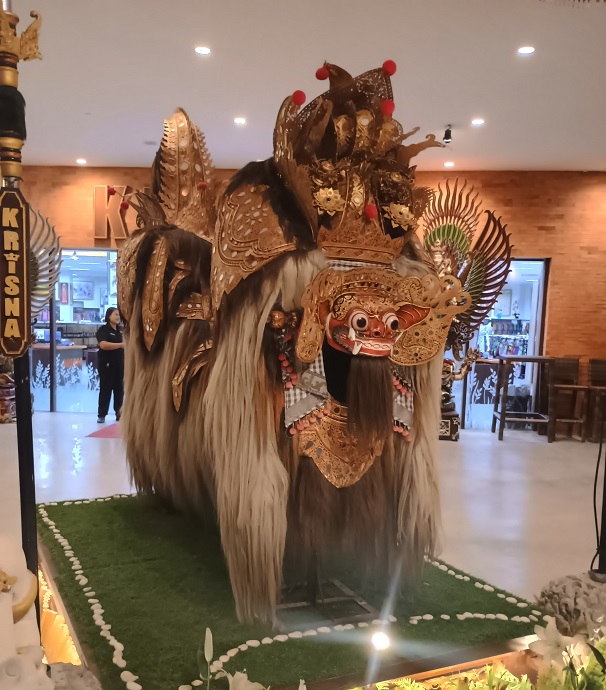 ಅಲ್ಲಿ ಕೆಲವು ಫೊಟೊ ಕ್ಲಿಕ್ಕಿಸಿ ಮಾಲ್ ನ ಒಳಗಡೆ ಹೋದಾಗ, ವೈಭವಯುತವಾದ ಚಿತ್ರಣ. ಮುಖ್ಯದ್ವಾರದಲ್ಲಿ ಇರಿಸಲಾಗಿದ್ದ, ಅಲಂಕೃತ ವಿಚಿತ್ರ ಪ್ರಾಣಿಯೊಂದರ ಪ್ರತಿಕೃತಿ ಗಮನ ಸೆಳೆಯಿತು. ಅದು ಬಾಲಿನೀಸ್ ಸಂಸ್ಕೃತಿಯಲ್ಲಿ ಅದೃಷ್ಟ ಎಂದು ನಂಬಲಾಗುವ ಕಾಲ್ಪನಿಕ ಪ್ರಾಣಿ ‘ಬಾರಂಗೊ’ (Barong) ಅಂತೆ. ಬಾಲಿನೀಸ್ ‘ಬಾರಂಗೊ’ ನೃತ್ಯಪ್ರಕಾರದಲ್ಲಿ ಇಂತಹ ಬೊಂಬೆಯನ್ನು ತಮ್ಮ ಮೈಯಲ್ಲಿ ಆಧರಿಸಿಕೊಂಡು ಕಲಾವಿದರು ನೃತ್ಯ ಮಾಡುತ್ತಾರಂತೆ.