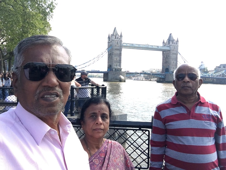 ಲಂಡನ್ ಬ್ರಿಡ್ಜ್ ಈಸ್ ಫಾಲಿಂಗ್ ಡೌನ್ ಫಾಲಿಂಗ್ ಡೌನ್ ಪ್ರೈಮರಿ ಶಾಲೆ ಪದ್ಯವನ್ನು ನೆನಪಿಸಿಕೊಳ್ಳುತ್ತಾ, ಲಂಡನ್ ಬ್ರಿಡ್ಜ್ ನೋಡಲು ಹೊರಟೆವು ಥೇಮ್ಸ್ ನದಿಗೆ ಅಡ್ಡಲಾಗಿ ಕಟ್ಟಲಾದ ಲಂಡನ್ ಬ್ರಿಡ್ಜ್ ಗೆ ತನ್ನದೇ ಆದ ಇತಿಹಾಸ ಇದೆ. ಪ್ರಪ್ರಥಮವಾಗಿ ಕ್ರಿ.ಶ 50 ರಲ್ಲಿ ದಕ್ಷಿಣ ಲಂಡನ್ ಮತ್ತು ಕೇಂದ್ರ ಲಂಡನ್ ಸಂಪರ್ಕಿಸಲು ಮರದ ದಿಮ್ಮಿಗಳಿಂದ ಕಟ್ಟಿ, ಅನೇಕ ಸಲ ಬೀಳಿಸಿ ಬೀಳಿಸಿ ಹೊಸದಾಗಿ ಕಟ್ಟುತ್ತಿದ್ದರು. ಆದ್ದರಿಂದಲೇ ಲಂಡನ್ ಬ್ರಿಡ್ಜ್ ಈಸ್ ಫಾಲಿಂಗ್ ಡೌನ್ ಫಾಲಿಂಗ್ ಡೌನ್ ಪದ್ಯ ಹುಟ್ಟಿಕೊಂಡಿರುವುದು. 12ನೇ ಶತಮಾನದಲ್ಲಿ ಕಲ್ಲಿನ ಸೇತುವೆ ಕಟ್ಟಿದ್ದರು. ಈ ಕಲ್ಲಿನ ಸೇತುವೆ ಸುಮಾರು 600 ವರ್ಷಗಳ ಕಾಲ ಉಪಯೋಗದಲ್ಲಿತ್ತು ಈ ಸೇತುವೆಯ ಜೊತೆಗೆ ಅಂಗಡಿ ಮುಂಗಟುಗಳನ್ನು ಸಹ ಕಟ್ಟಿದ್ದರು. ಕ್ರಿ ಶ 1831 ರಲ್ಲಿ ಈ ಸೇತುವೆಯನ್ನು ಕೆಡವಿ ಅದರ ಸಿಮೆಂಟ್ ಇಟ್ಟಿಗೆಗಳನ್ನು ಅಮೆರಿಕಾದ ಅರಿಝೋನಾಕ್ಕೆ ಮಾರಿ ( ಸಾಗಿಸಿ) ಅಲ್ಲಿ ಕೆರೆ ಕಟ್ಟಿದರಂತೆ. ಇ೦ಗ್ಲೆ೦ಡ್ನಿ೦ದ ಅಮೇರಿಕಾಗೆ ಇಟ್ಟಿಗೆಗಳನ್ನು ಸಾಗಿಸಿದರೆ೦ದರೆ ನ೦ಬುವುದು ಸ್ವಲ್ಪ ಕಷ್ಟವಾಯಿತು. ಕ್ರಿ ಶ 1832 ರಲ್ಲಿ ವಿಕ್ಟೋರಿಯಾ ಕಲ್ಲಿನ ಕಮಾನಿನ ಸೇತುವೆ ಕಟ್ಟಿದರಂತೆ. ನ೦ತರ ಕ್ರಿ ಶ 1971ರಲ್ಲಿ ಈ ಸೇತುವೆಯಿಂದ ಕೆಲವೇ ಮೈಲುಗಳ ದೂರದಲ್ಲಿ ಹೊಸ ಸೇತುವೆಯನ್ನು ಕಟ್ಟಿದರಂತೆ. ಅದೇ ಈಗಿನ ಟವರ್ ಬ್ರಿಡ್ಜ್. ಈಗಿನ ಪ್ರವಾಸಿ ತಾಣ. ಈ ಟವರ್ ಬ್ರಿಡ್ಜ್ಲಂಡನ್ ಬ್ರಿಡ್ಜ್ನಿ೦ದ ಸ್ವಲ್ಪ ದೂರದಲ್ಲಿದೆ. ಅದರ ಮುಂದೆ ನಿಂತು ವಿವಿಧ ಭ೦ಗಿಗಳಲ್ಲಿ ಫೋಟೋ ತೆಗೆದುಕೊಂಡು, ನಂತರ ಪಕ್ಕದಲ್ಲಿ ಕೋಟೆಯಂತಿದ್ದ ಲಂಡನ್ ಟವರ್ ಗೆ ತೆರಳಿದೆವು.